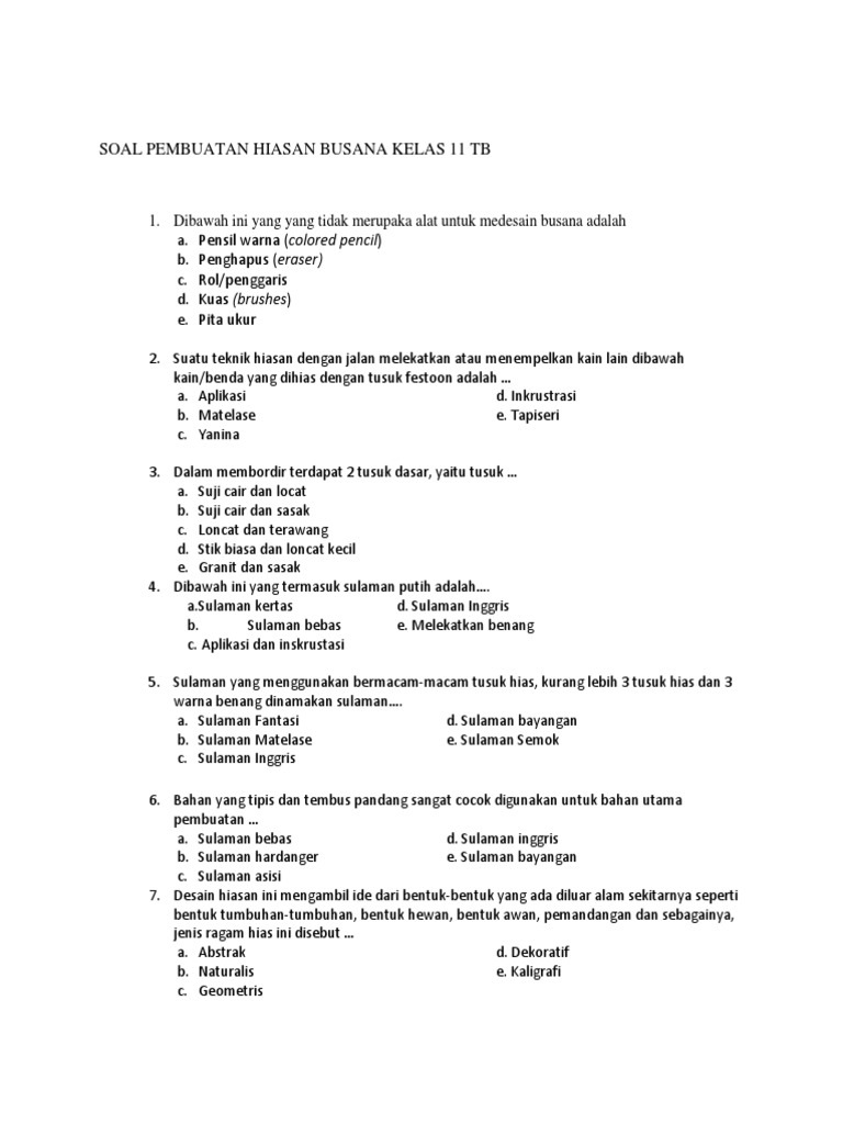 Soal Pembuatan Hiasan Busana Kelas 11 Tb Pdf